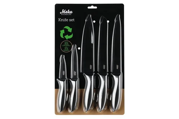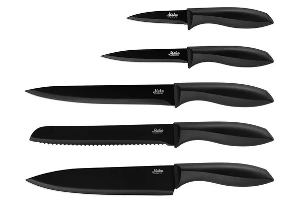 Nugadel on kena disain, tumedad terad sobivad ideaalselt tumeda plastkäepidemega. Terad on roostevabast terasest ja keraamilise kattega. Väga kasulik noakomplekt sisaldab viit nuga: kokanuga, viilutusnuga, leivanuga, universaalnuga ja koorimisnuga. Soovitatav on käsitsi pesemine.